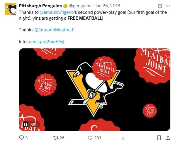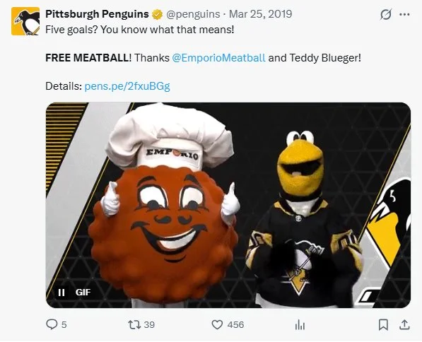 When the Penguins scored 5 goals in a game, all fans would recieve a ‘Free Meatball’ at our Downtown or Wexford location the day after the game.
